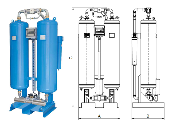 Heatless regenerated adsorption dryer B-DRY 110-1000 adsorption dryers have been designed for continuous separation of water vapour from compressed air thus reducing dew point. Operation of dryer requires two columns operated alternately.